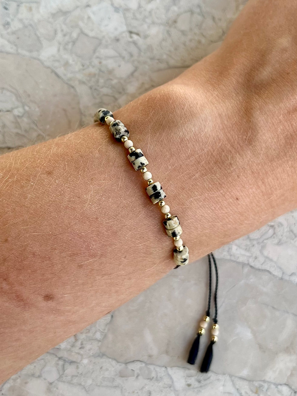 Bransoletka na nici jedwabnej z delikatnych kamieni naturalnych i złotych kuleczek – lekka, kobieca i idealna do warstwowych stylizacji.